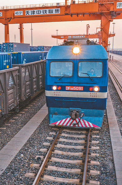 4月27日,1600余吨粮食货物从长春搭乘铁海联运班列到达天津港,将转乘“中远海运新沧州”轮出发前往广西贵港。 人民日报记者 靳 博摄