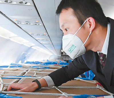 4月12日,江西南昌,机组人员在国际航空货运包机机舱内检查发往日本大阪的防疫物资。 时 雨摄(影像中国)
