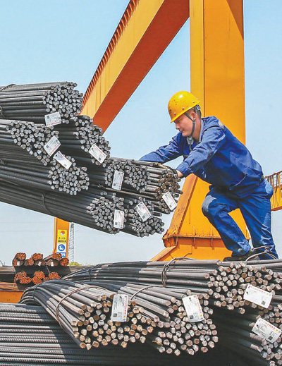 4月9日,浙江省湖州市德清县雷甸镇的升华物流园区码头上,工人在吊放钢材。 姚海翔摄(影像中国)