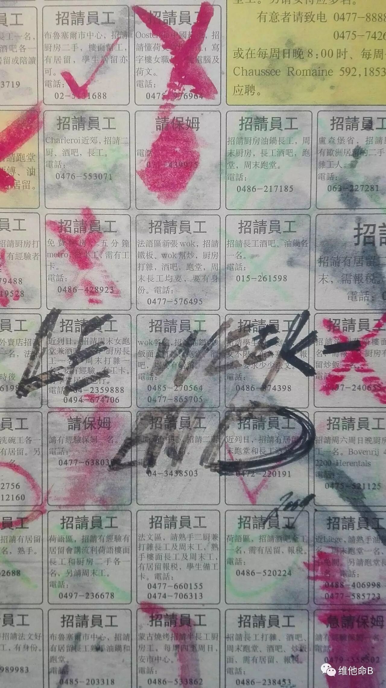 我曾经画过一本册子,就叫《周末》(LE WEEK END)。描绘一些打工时常见的场景和角色,其实就是描绘“疲惫”。册子的封面我直接剪了一张当时华人报纸的招工广告,上面还有我找工时做的划改痕迹。