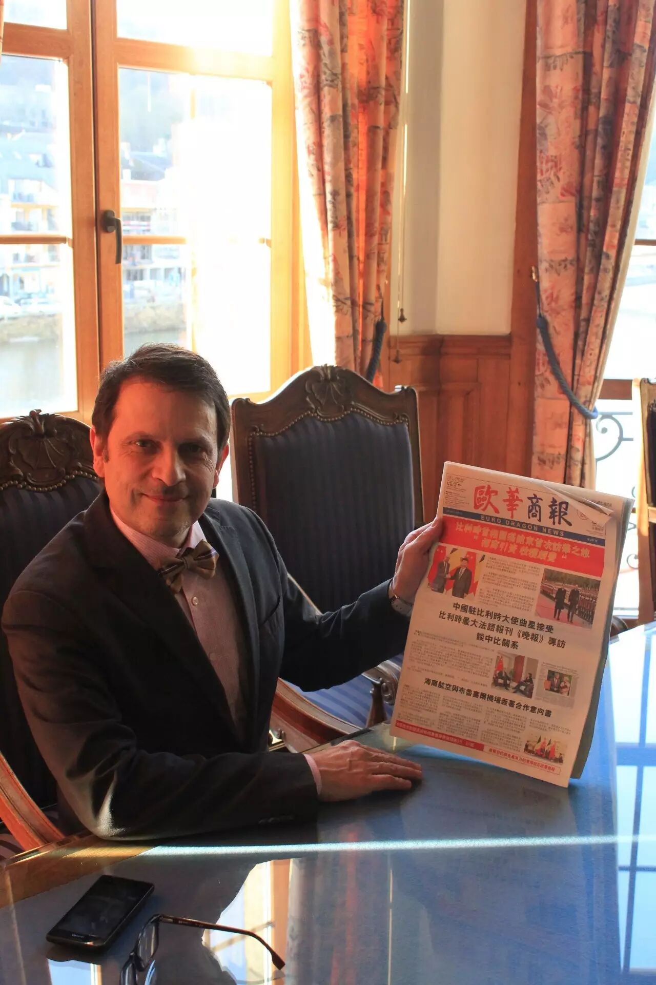 市长先生和居住在迪南的华人社区联系紧密,图为他在《中国城大酒楼》与东主杨军伟夫妇的合影