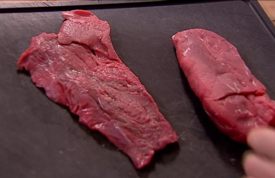 生产商会使用锤肉器使肉变得更软更嫩。“实际上,是用一种压缩梳棉机,它会切断肉的纤维,使肉变得软、嫩。”我们可以观察到肉上有十几个裂缝。肉中的纤维也重要,有时候即使是同一种肉,我们也要作对比。