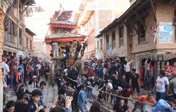 當天,尼泊爾古城巴德崗萬人空巷,圍觀拉戰車、竪旗杆狀木質林伽等活動以迎接新年的到來。