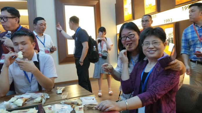 7月14日下午,70余位海外华文媒体代表走进天津百年老字号企业“桂发祥”,参观十八街麻花文化馆,听取讲解,并现场参观了麻花生产线,感受传统食品文化。桂发祥十八街麻花与天津狗不理包子、耳朵眼炸糕并称“天津三绝”,位列其首。李雪峰摄
