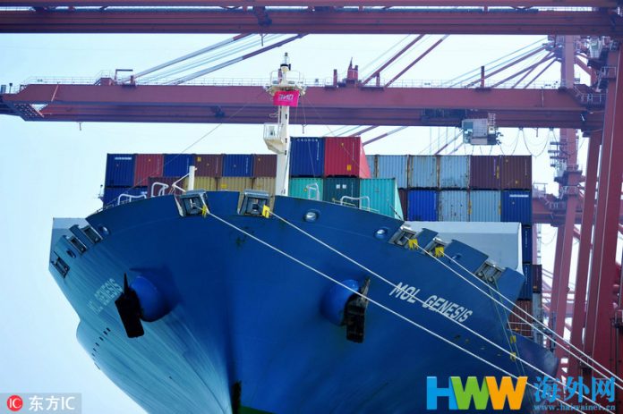 2018年6月8日,山东青岛港外贸集装箱码头,班轮在装卸集装箱。