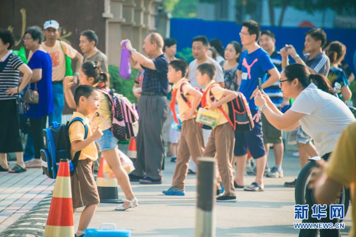开学日,家长在校门口为孩子拍摄入学照(图源:新华网)