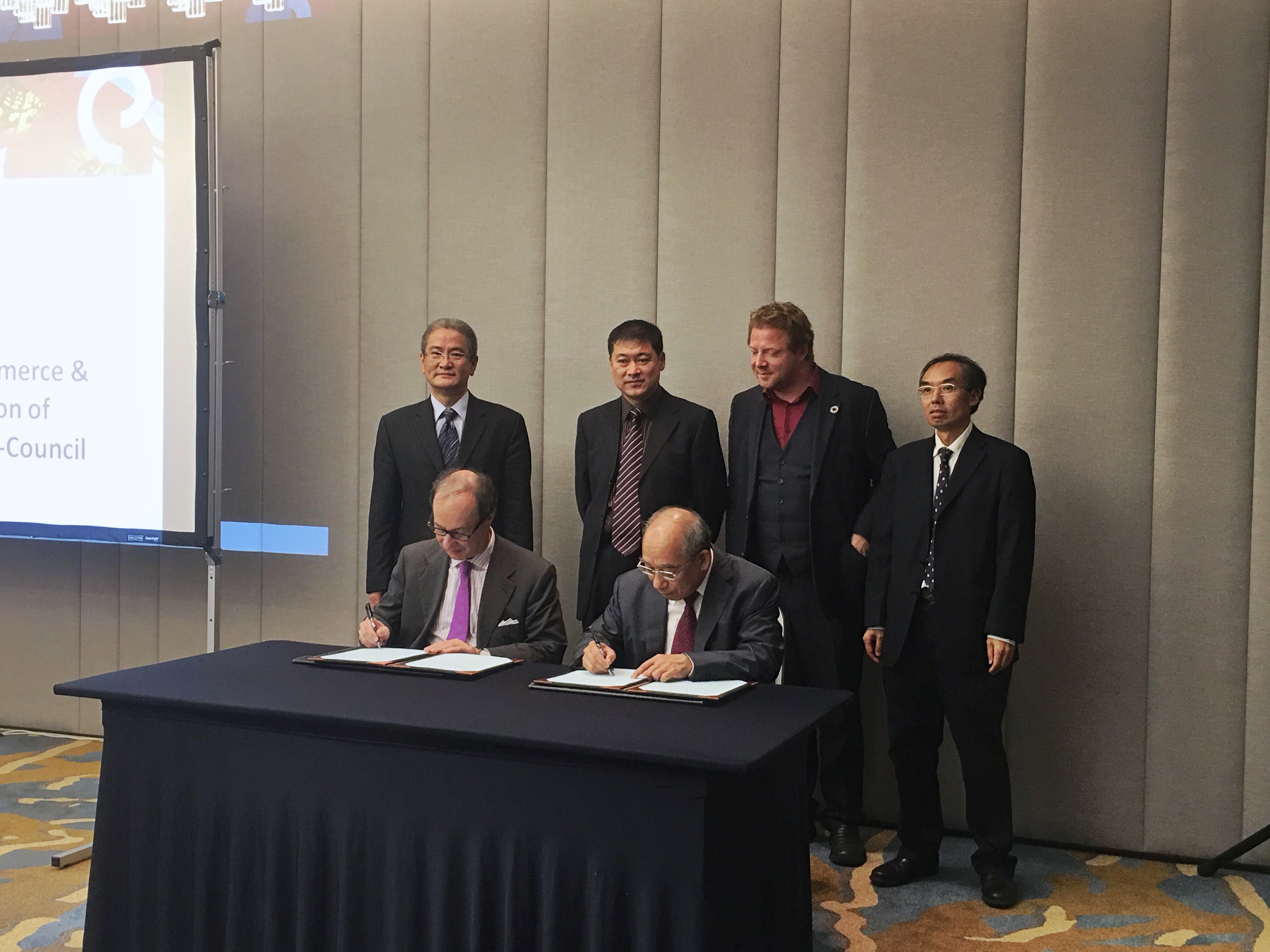 签字仪式气氛融洽,比中商会主席(BCECC)德威特先生与辽宁省贸促会韩清先生握手合照,为中比经济交流再填一笔新单。
