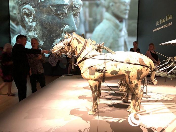 进门处古色古香的兵马战车,继而是神秘的“东汉双兽”,最深处则矗立着惟妙惟肖的秦始皇兵马俑……衬以背景墙上的动画,一件件国宝就像驾着“祥云”穿越时空而来。12月13日晚,“秦始皇兵马俑:永恒的守卫”展览在新西兰蒂帕帕国家博物馆举行开幕式,让人仿若置身古老的东方国度。这场期待已久的展览将于15日起正式对新西兰观众开放,并持续到明年4月22日。