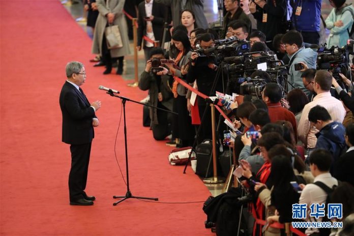 3月12日,教育部部长陈宝生在“部长通道”接受采访。(新华社记者 金立旺/摄)