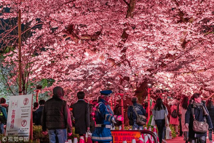 一路风情编辑精选日本东京千鸟渊迎来平成年最后樱花盛典 3 4 月, 2019当地时间2019年4月2日,日本东京,随着樱花的满开,东京千鸟渊于3月底至4月上旬夜间点灯举办梦幻的樱花祭活动。正值年号即将更替,各国游客纷纷前来观赏日本平成年最后的樱花盛典。