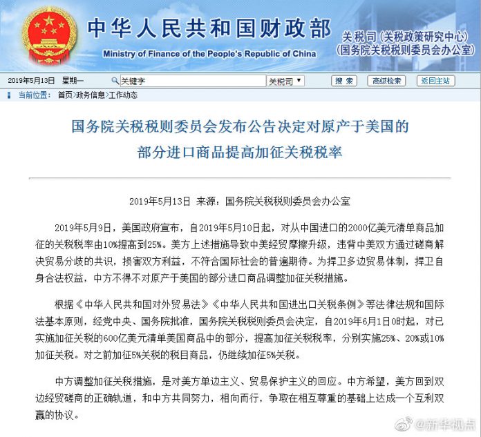 新华社北京5月13日电 国务院关税税则委员会13日发布公告,2019年5月9日,美国政府宣布,自2019年5月10日起,对从中国进口的2000亿美元清单商品加征的关税税率由10%提高到25%。美方上述措施导致中美经贸摩擦升级,违背中美双方通过磋商解决贸易分歧的共识,损害双方利益,不符合国际社会的普遍期待。为捍卫多边贸易体制,捍卫自身合法权益,中方不得不对原产于美国的部分进口商品调整加征关税措施。