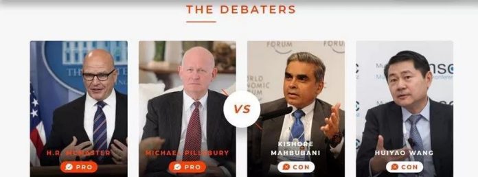 辩论的反方,是中国与全球化智库(CCG)理事长王辉耀,以及新加坡国立大学李光耀公共政策学院院长马凯硕。