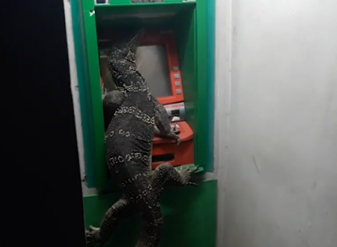 泰国网友拍到一只巨大的蜥蜴趴在自动取款机上“取钱”(图源:脸书)