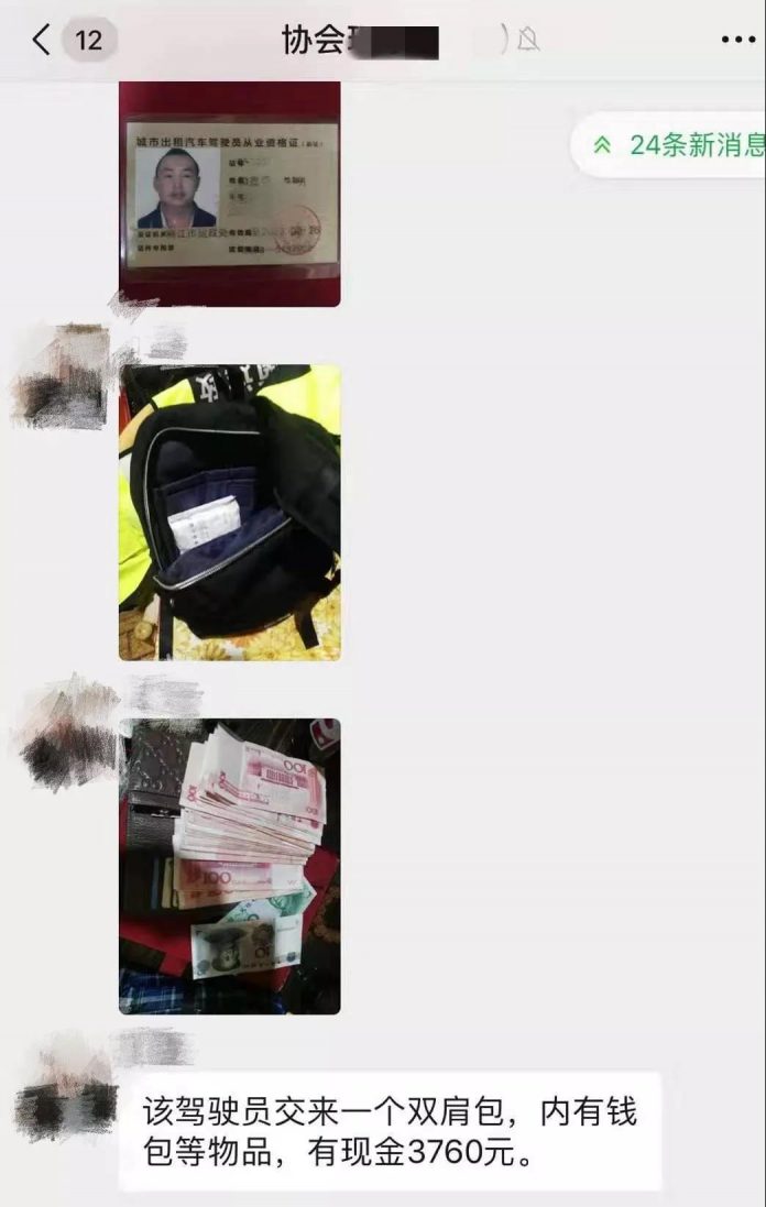 7月4日晚,丽江市出租车协会理事群收到这样一条信息:“该驾驶员交来一个双肩包,内有钱包等物品,有现金3760元”。