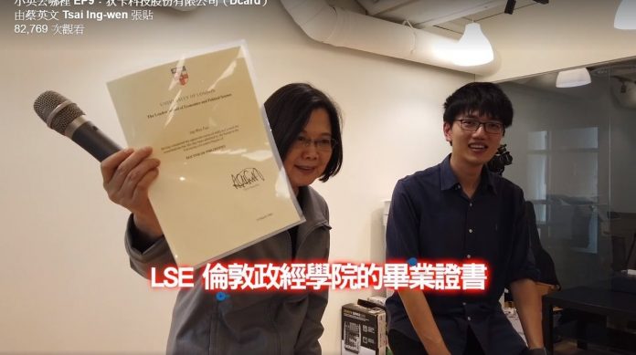 据“联合新闻网”报道,蔡英文10日在社交网络发布了一段参观某科技公司的影片,首次“开箱”自己伦敦政经学院(LSE)的毕业证书。在视频中举起毕业证书向公司员工展示,强调“这次我把伦敦政经学院的毕业证书给带来了!”