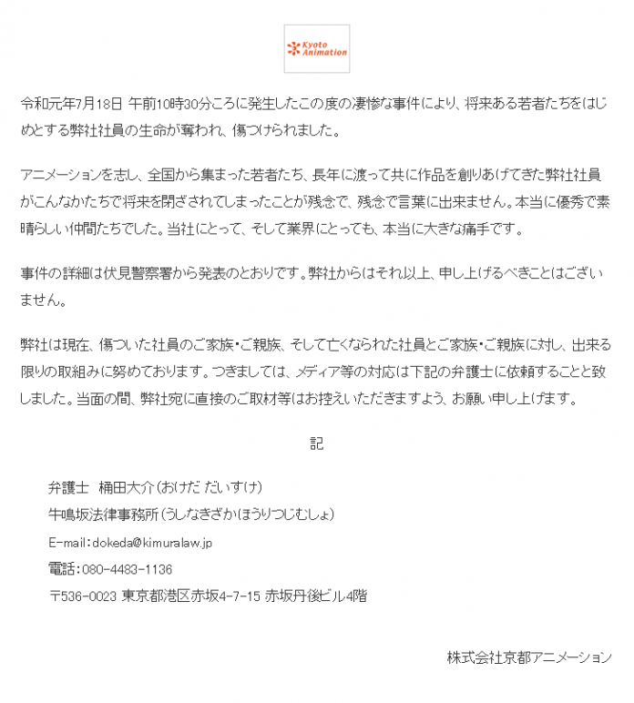 该工作室在声明中表示,为来自全国各地的以动画为志并将有一番作为的年轻人以及多年来共事创作的优秀社员们,在火灾中以这样的方式被剥夺未来感到极度痛心。事件详情以警方发布为准,京阿尼方面不便再做过多说明,同时也暂时婉拒直接采访。