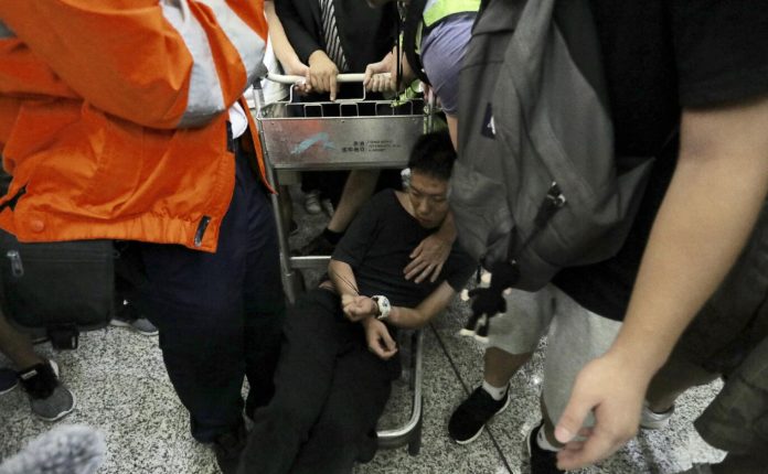 海外网8月14日电 13日,因非法示威活动,香港机场陷入持续“瘫痪”,至晚间,“示威”更是演变成不折不扣的暴力。 据大公文汇全媒体报道,在13日晚香港国际机场的非法集会中,有身份不明人士被暴徒用索带绑住双手,按在行李手推车上并不断踢打他,一位外国记者极力保护,并劝说示威者停手。暴徒无视劝说,仍然继续围殴这名男子,并阻止救护人员及伤者离开。