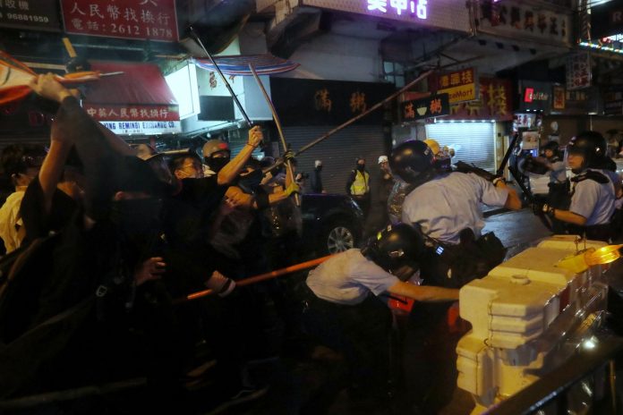 综合“东网”等港媒报道,26日凌晨1点30分,香港警方就昨日(25日)示威游行引发的连串冲突交代详情。警察公共关系科高级警司余铠均表示,25日7时40分,大批示威者在荃湾二陂坊破坏一间“麻雀馆”(麻将馆),撬开店铺铁闸,破坏铺内闭路电视,继而打烂玻璃,并向铺内职员及顾客爆粗指骂及言语恐吓。示威者其后在附近一带娱乐场所、餐厅及店铺进行破坏,情况失控。