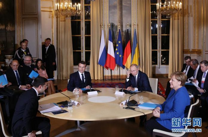 12月9日,在法国巴黎,乌克兰总统泽连斯基、法国总统马克龙、俄罗斯总统普京和德国总理默克尔出席“诺曼底模式”四国峰会。 (图源:新华网)