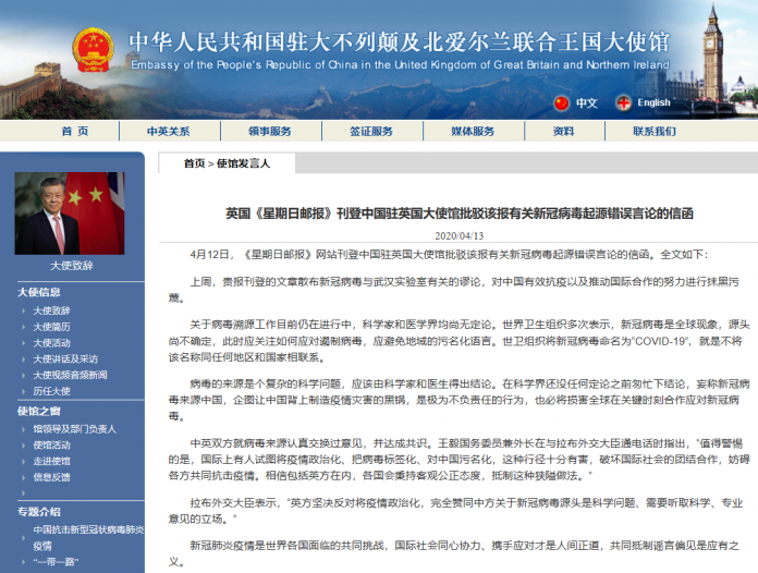 【海外网4月13日综合报道】据中国驻英国大使馆官方网站13日消息,4月12日,《星期日邮报》网站刊登中国驻英国大使馆批驳该报有关新冠病毒起源错误言论的信函。全文如下: