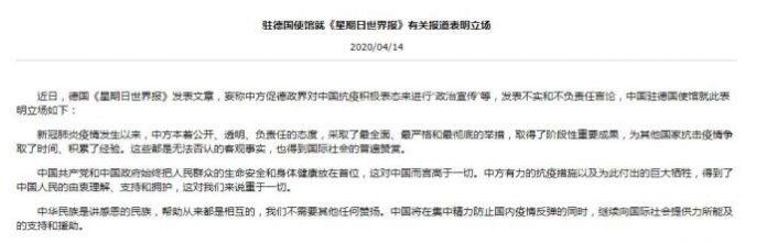 中新网4月15日电 近日,德国《星期日世界报》发表文章,妄称中方促德政界对中国抗疫积极表态来进行“政治宣传”等,发表不实和不负责任言论。14日,中国驻德国大使馆网站刊文表明立场。