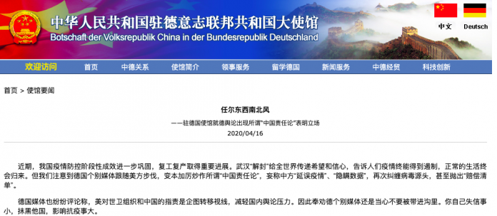 【海外网4月17日综合报道】据中国驻德国大使馆官网消息,中国驻德国使馆就德舆论出现所谓“中国责任论”表明立场,详情如下: