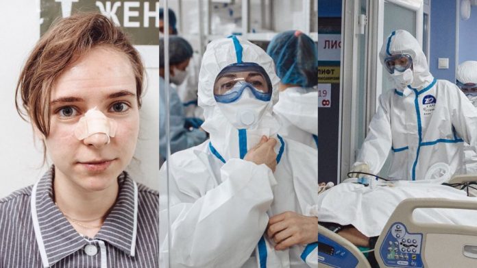 今日俄罗斯电视台称,这些数字转化为医生们的巨大工作量,他们在12个小时的轮班中必须不断穿戴防护装备。医护人员的脸上都留下了眼镜、口罩的明显痕迹。它们就像深深的皱纹或伤疤,并将一直存在,直到流行病最终结束。“我希望人们能通过这些痕迹认出我们。”维克多笑着对记者展示鼻梁上的痕迹。
