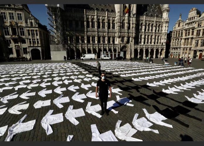5月7日,阳光明媚,春风拂面,这是比利时封禁的第55天。布鲁塞尔市中心照例肃静一片,没了游客的喧闹,少了行人的拥挤,在世界最美大广场上,上千件白色的厨师外套被散落在地,这是40万餐饮人在用特殊的方式向人们诉说,疫情期间餐饮业遭到的重创:“I am dropping my chef’s jacket”(我正在脱下厨师服),组织者为此次活动的命名。