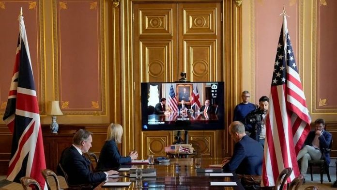 当地时间5月5日,英美贸易谈判视频会议现场(图源:路透社)