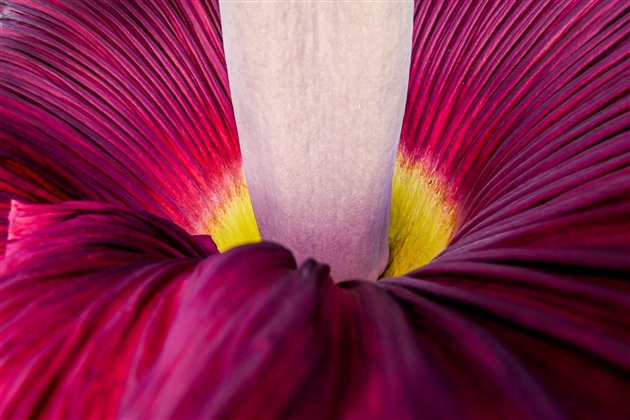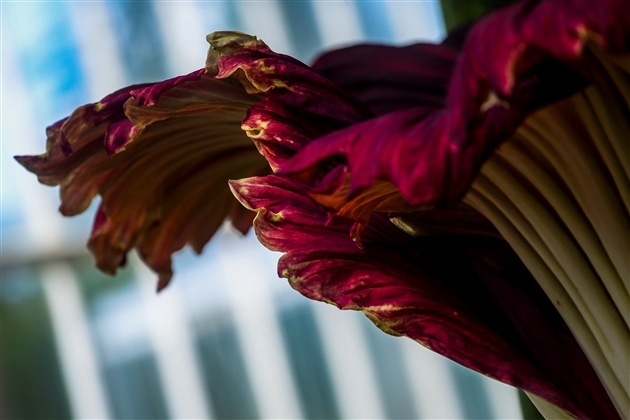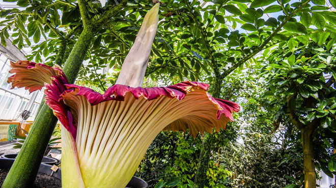 Illustration picture shows a Titan Arum flower flourishes since Yesterday at the Belgian National Botanic Gardens in Meise, Thursday 14 May 2020. The Titan Arum is the biggest flower on earth and it takes several years for the plant to make one single flower blossom. Particular to the flower is its strong, bad smell. BELGA PHOTO LAURIE DIEFFEMBACQ