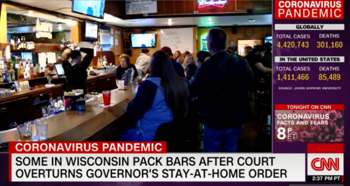 【海外网5月15日|战疫全时区】威斯康星州最高法院于当地时间14日驳回了该州的“居家令”,并裁定州长托尼·埃弗斯将该法令延长至5月底是越权行为。“居家令”被推翻后,一段视频很快在社交平台上引发热议,画面显示,该州一家酒吧重新开门仅45分钟后就爆满,没有一名顾客佩戴口罩。