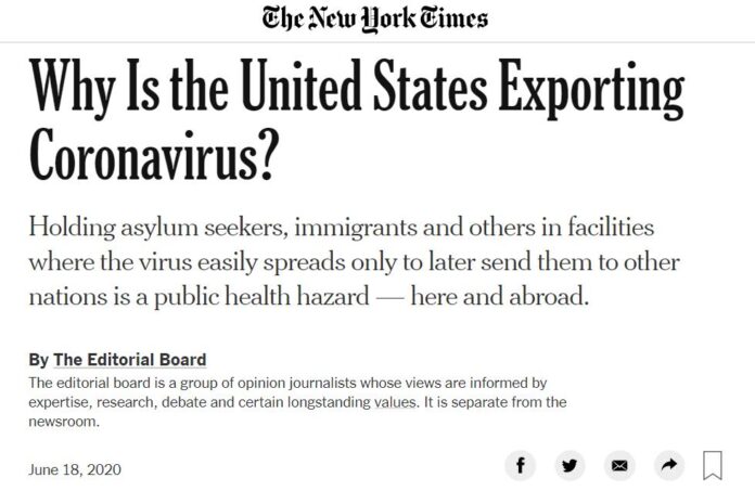 《纽约时报》18日发布一篇题为《为什么美国出口新冠病毒?》的社论,批评美国政府在疫情期间遣返移民的行为,给一些国家的疫情防控造成巨大压力,但目前美国遣返航班却仍未停飞。