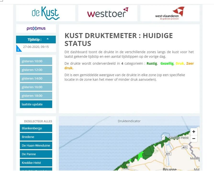 您可以在出发前利用线上小工具来查看游客密度(https://www.dekust.be/nl/strand-dijk-en-drukte)。每片区域都会用不同颜色标注出来,人少到人多依次为:深绿色、浅绿色、黄色、橙色。如果您要去的海滩被标为橙色,那您最好调整一下目的地。