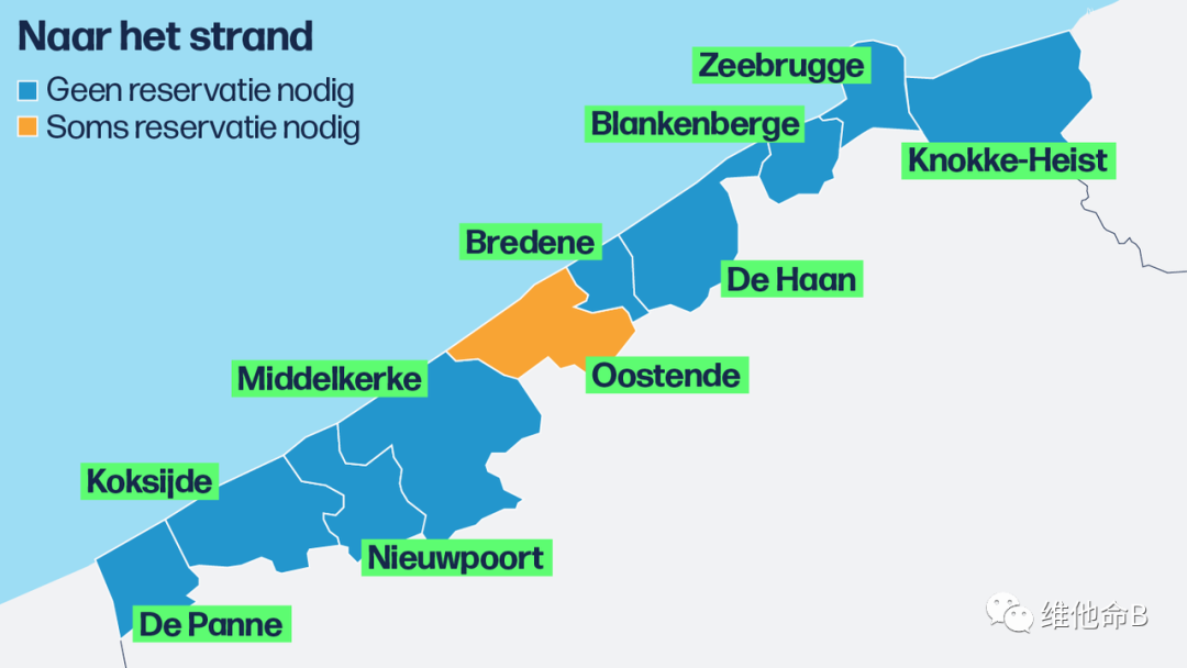 如果您计划在人多的时候前往位于Ostend的Groot,Klein和Groei这三处海滩,您需要提前三天预约。其他海滩则不需要预约(见下图)。
