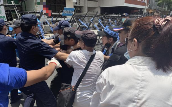 海外网6月29日电 国民党党团28日深夜突袭占领台“立法院”议场,民进党“立委”29日上午破门而入,蓝绿双方一度推挤互骂。而在“立法院”场外,抗议民众冲撞“拒马”,欲冲入院内,与警方数次爆发肢体冲突。