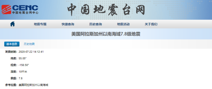 海聚推荐美国阿拉斯加州以南海域发生7.8级地震 触发海啸预警 22 7 月, 2020海外网7月22日电 据中国地震台网正式测定,北京时间7月22日14时12分(当地时间7月21日22时12分)在美国阿拉斯加州以南海域发生7.8级地震,震源深度10千米,震中位于北纬55.05度,西经158.50度。另据美国地质勘探局消息,此次地震已触发海啸预警。(海外网 王珊宁)本文系版权作品,未经授权严禁转载。海外视野,中国立场,浏览人民日报海外版官网——海外网www.haiwainet.cn或“海客”客户端,领先一步获取权威资讯。