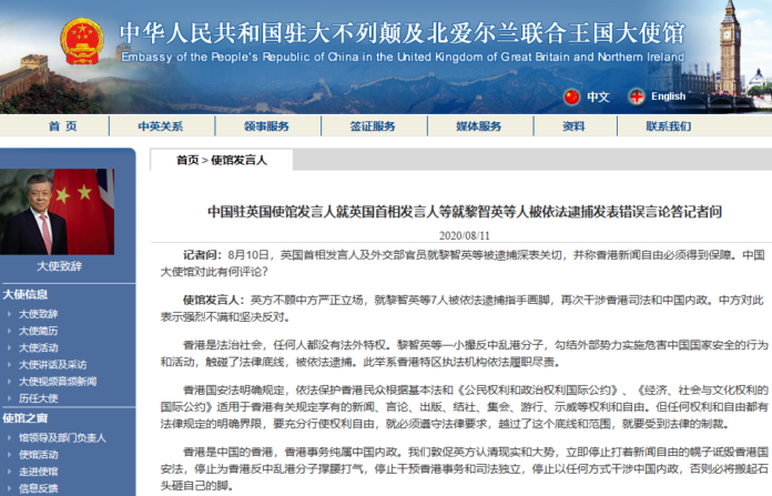 英方就黎智英等人被依法逮捕发表错误言论 中国驻英使馆回应
