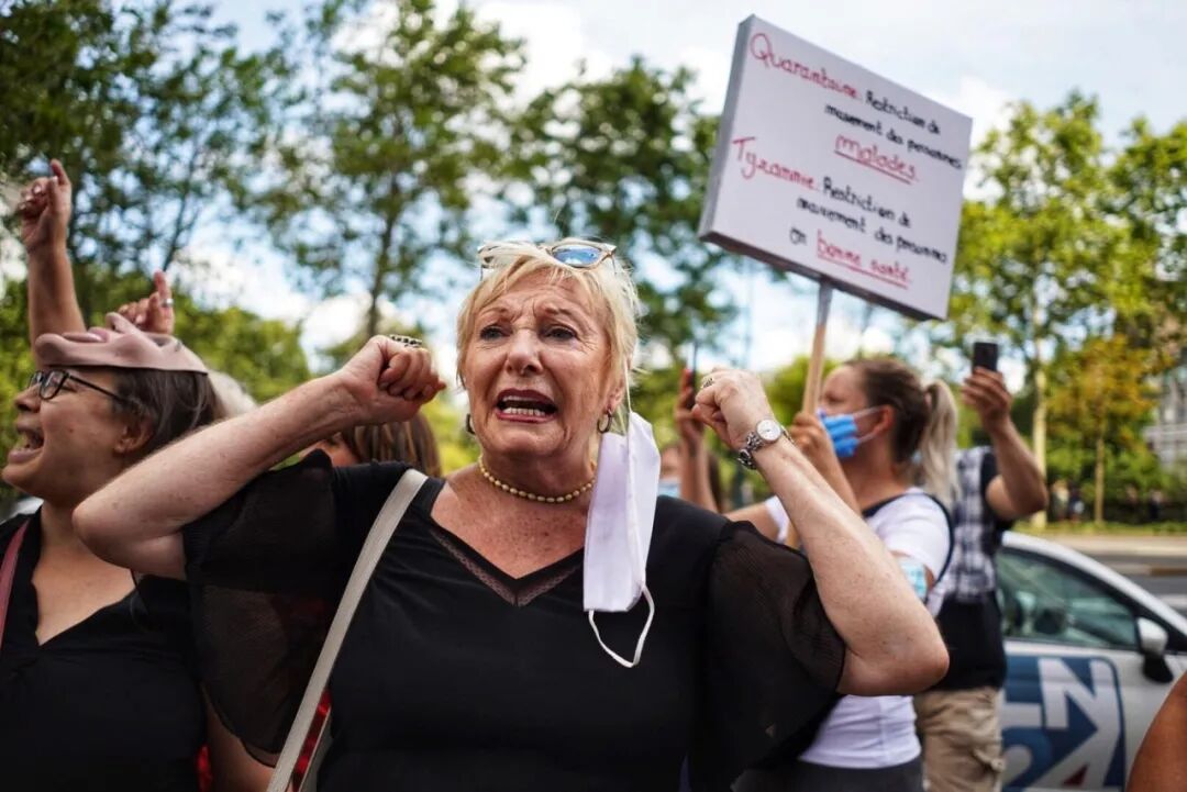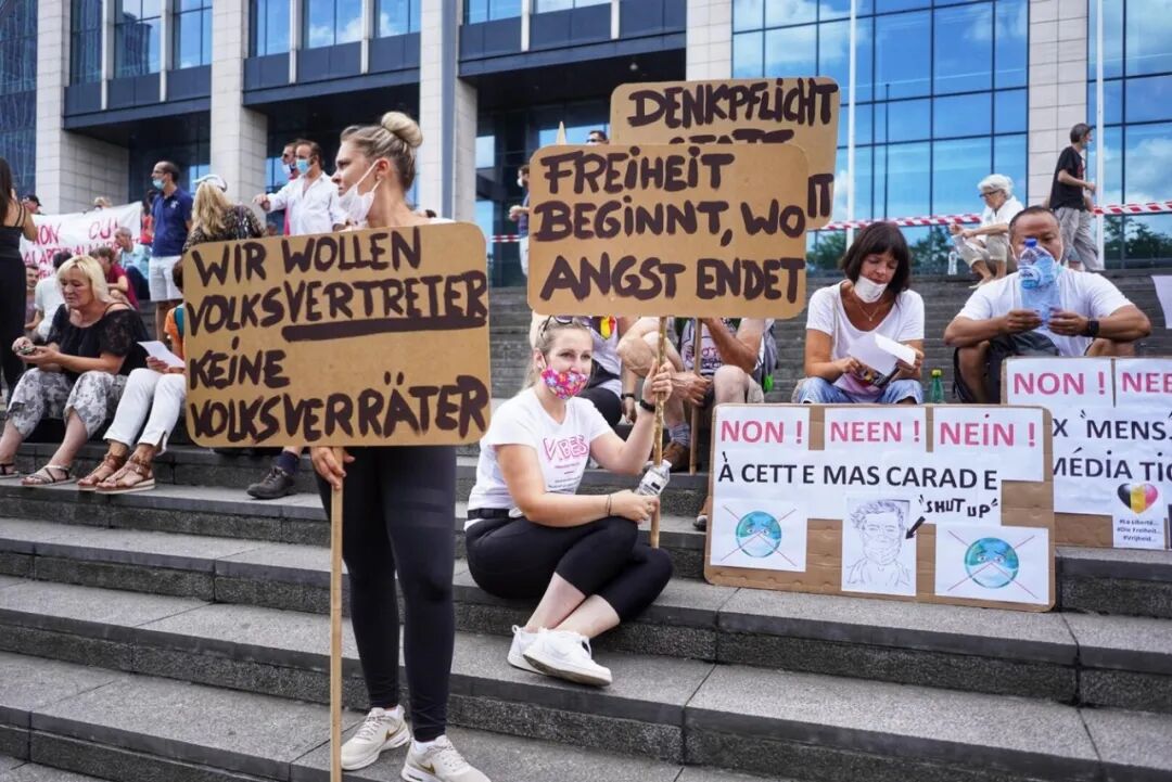 从周日中午开始,数百人聚集在布鲁塞尔金融塔前抗议比利时的防疫措施。
