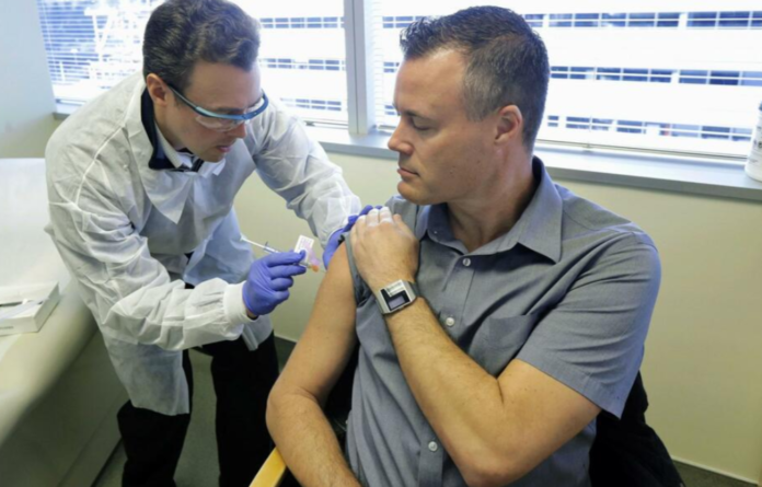 美国一位男性在接受新冠肺炎疫苗注射(共同社)
