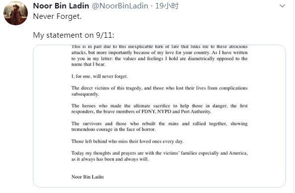 据《纽约邮报》网站11日报道,努尔·本·拉登当天在推特上分享了一封信,信中写道:“在过去的19年里,在这个可怕、悲惨的日子之后的每一天里,我都在想着你们,想着美国,并在私下里和你们一起为所有逝去的无辜生命而悲痛。”