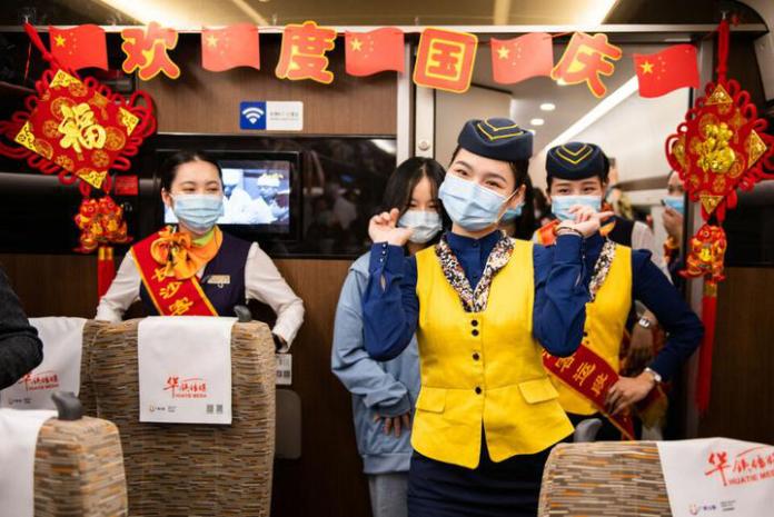 “复兴号”高铁列车上,乘务员在“喜迎国庆浓情中秋”活动中为旅客表演舞蹈。(图源:新华社)
