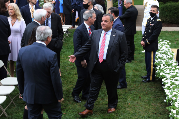 克里斯蒂(中)在白宫大法官提名式上,没有戴口罩。(图源:Getty)