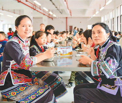2020年10月13日,贵州省册亨县高洛街道第一小学搬迁子女在学校食堂吃“营养餐”,值班老师在陪餐。 梁兴星摄(人民视觉)