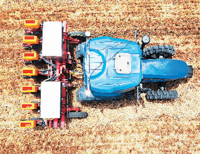 在河南省邓州市小杨营镇安众村,加装有北斗导航系统的拖拉机在无人驾驶状态下播种。 新华社记者 冯大鹏摄