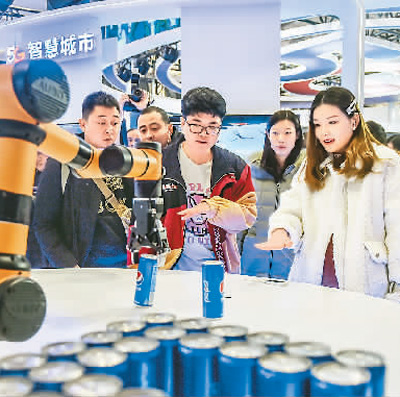 在北京市举行的2019世界5G大会上,参观者正控制机械臂抓取饮料,体验“隔空取物”。 新华社记者 彭子洋摄
