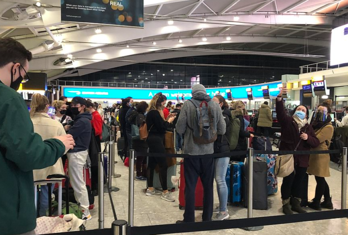海外网12月21日电 当地时间20日晚,英国伦敦机场陷入混乱,数百名乘客挤上爱尔兰针对英国禁令生效前最后一班飞机。