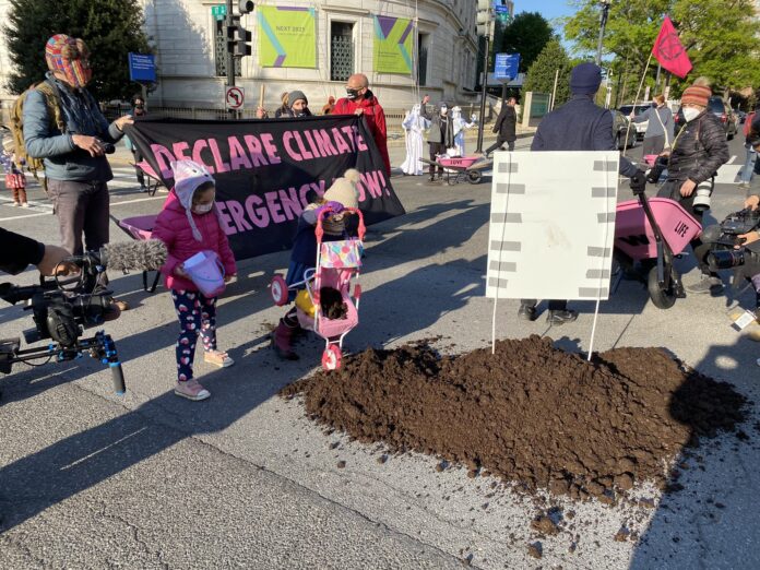 据美国《国会山报》报道,现场视频显示,至少十几名抗议者推着粉色的手推车前往白宫,车里装满了牛粪,随后他们将牛粪倾倒在白宫附近的街道上。他们还在牛粪上插了写着标语的横幅,上面写着“别再废话”、“立即宣布气候紧急状态”。