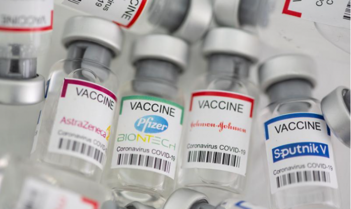 标着阿斯利康、辉瑞-德国生物新技术、强生等公司字样的疫苗瓶