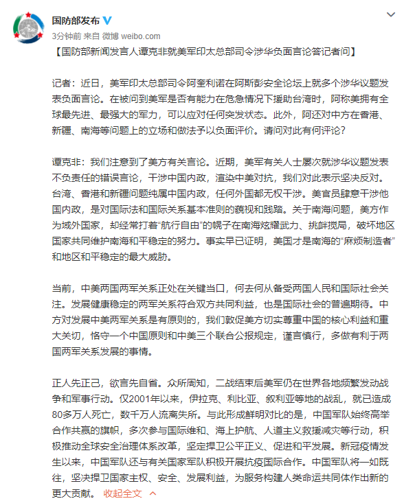 谭克非:我们注意到了美方有关言论。近期,美军有关人士屡次就涉华议题发表不负责任的错误言论,干涉中国内政,渲染中美对抗,我们对此表示坚决反对。台湾、香港和新疆问题纯属中国内政,任何外国都无权干涉。美官员肆意干涉他国内政,是对国际法和国际关系基本准则的藐视和践踏。关于南海问题,美方作为域外国家,却经常打着“航行自由”的幌子在南海炫耀武力、挑衅搅局,破坏地区国家共同维护南海和平稳定的努力。事实早已证明,美国才是南海的“麻烦制造者”和地区和平稳定的最大威胁。