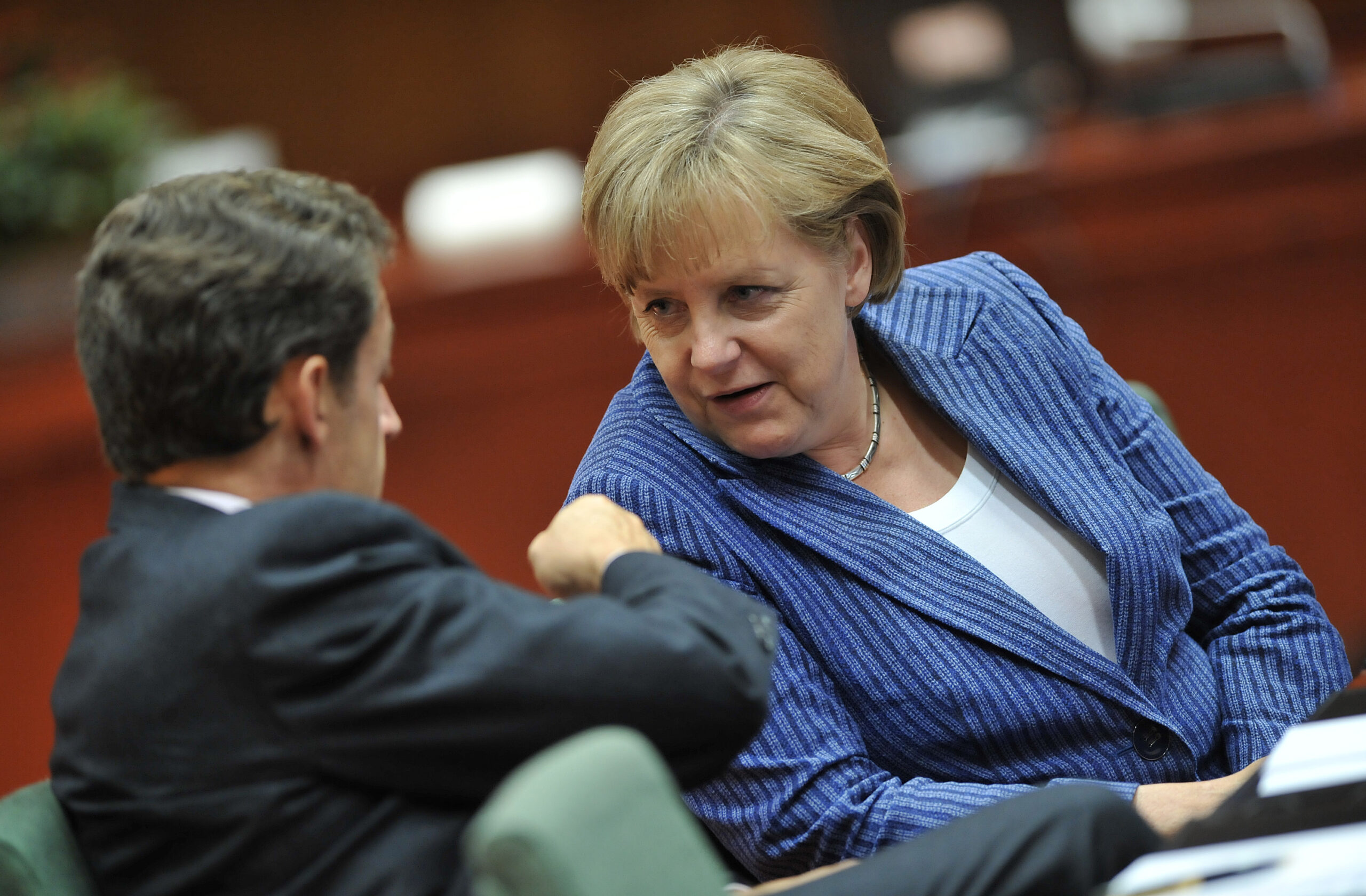 2011年6月23日,德国总理默克尔与时任法国总统萨科齐在比利时首都布鲁塞尔出席欧盟峰会时交谈。新华社记者武巍摄